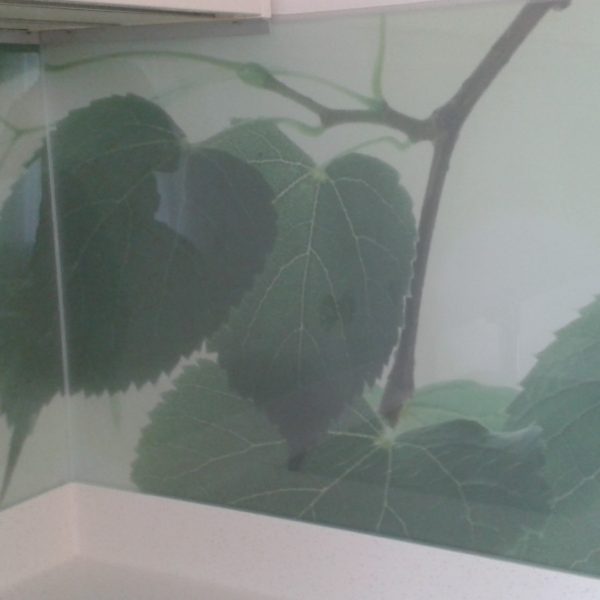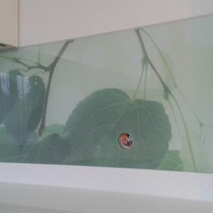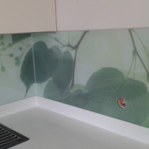 Obklad kuchyně – ESG Satinato osazené do lišt (snadná demontáž v případě výměny tapety) – podkladová dekorativní