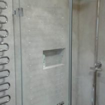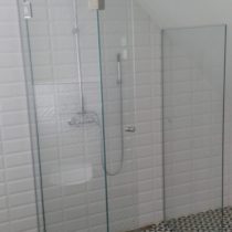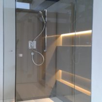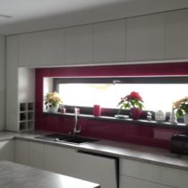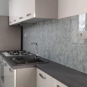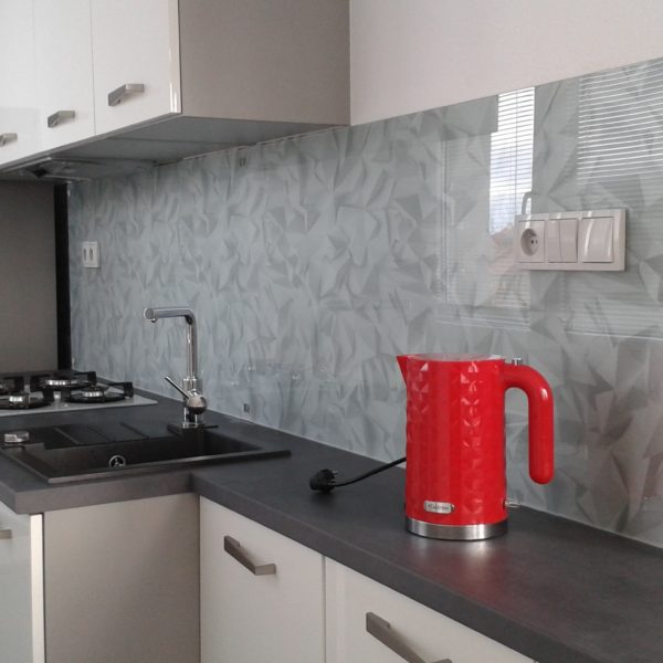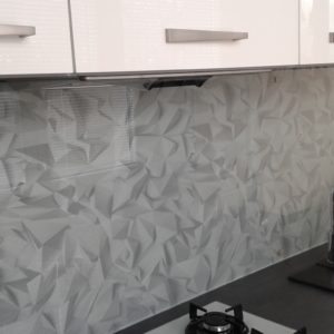 Skleněný obklad kuchyňské linky – bezpečnostní tepelně tvrzené čiré sklo – podklad dekorativní tapeta, uchycení na šrouby – moderní design